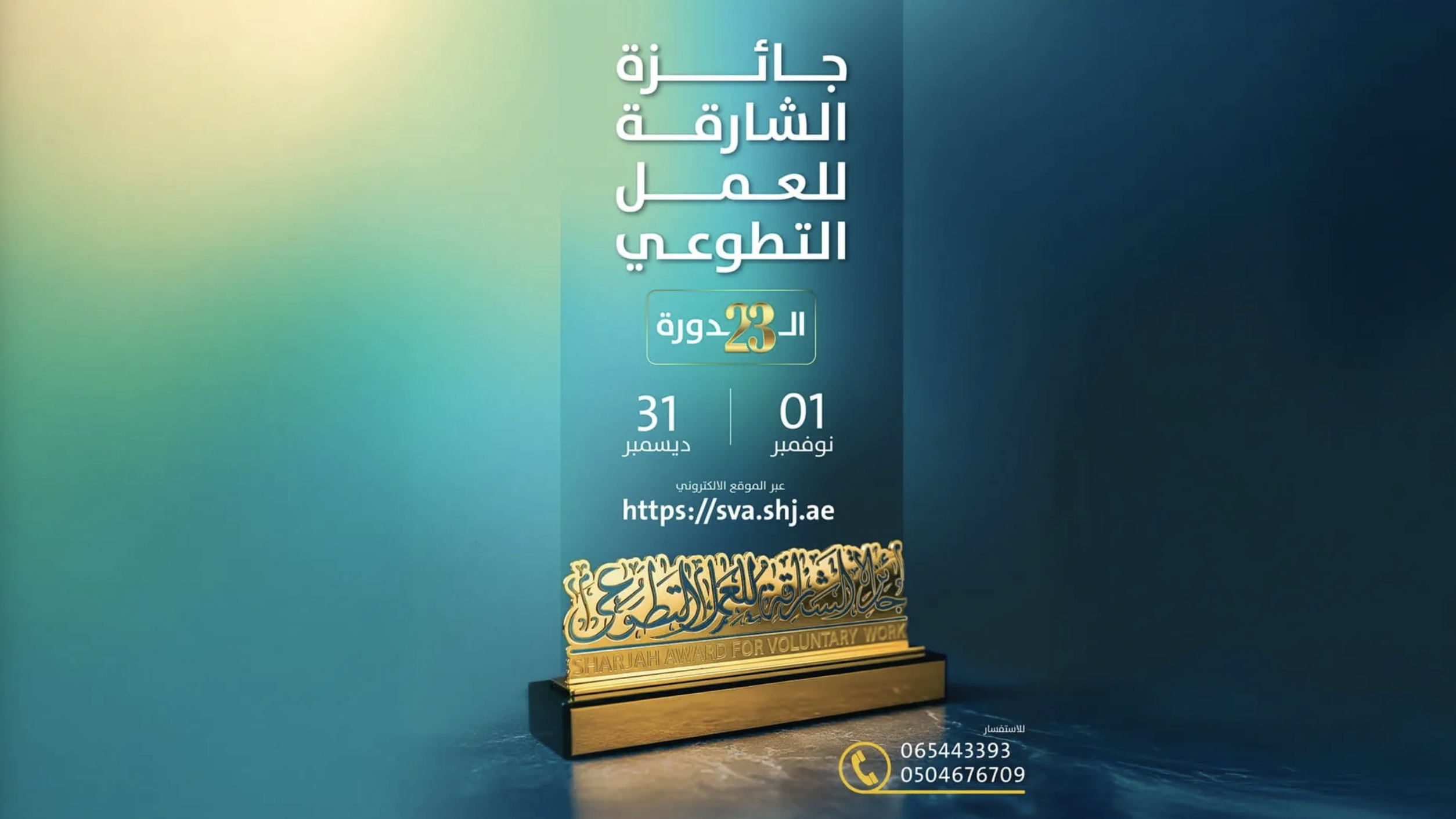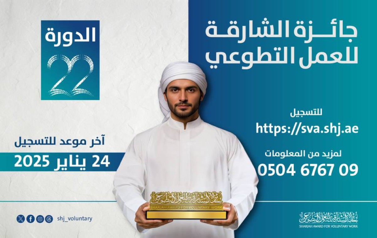 تواصل استقبال طلبات المشاركة حتى 31 ديسمبر 2025 جائزة الشارقة للعمل التطوعي الـ 23 تبرز دور المؤسسات التعليمية