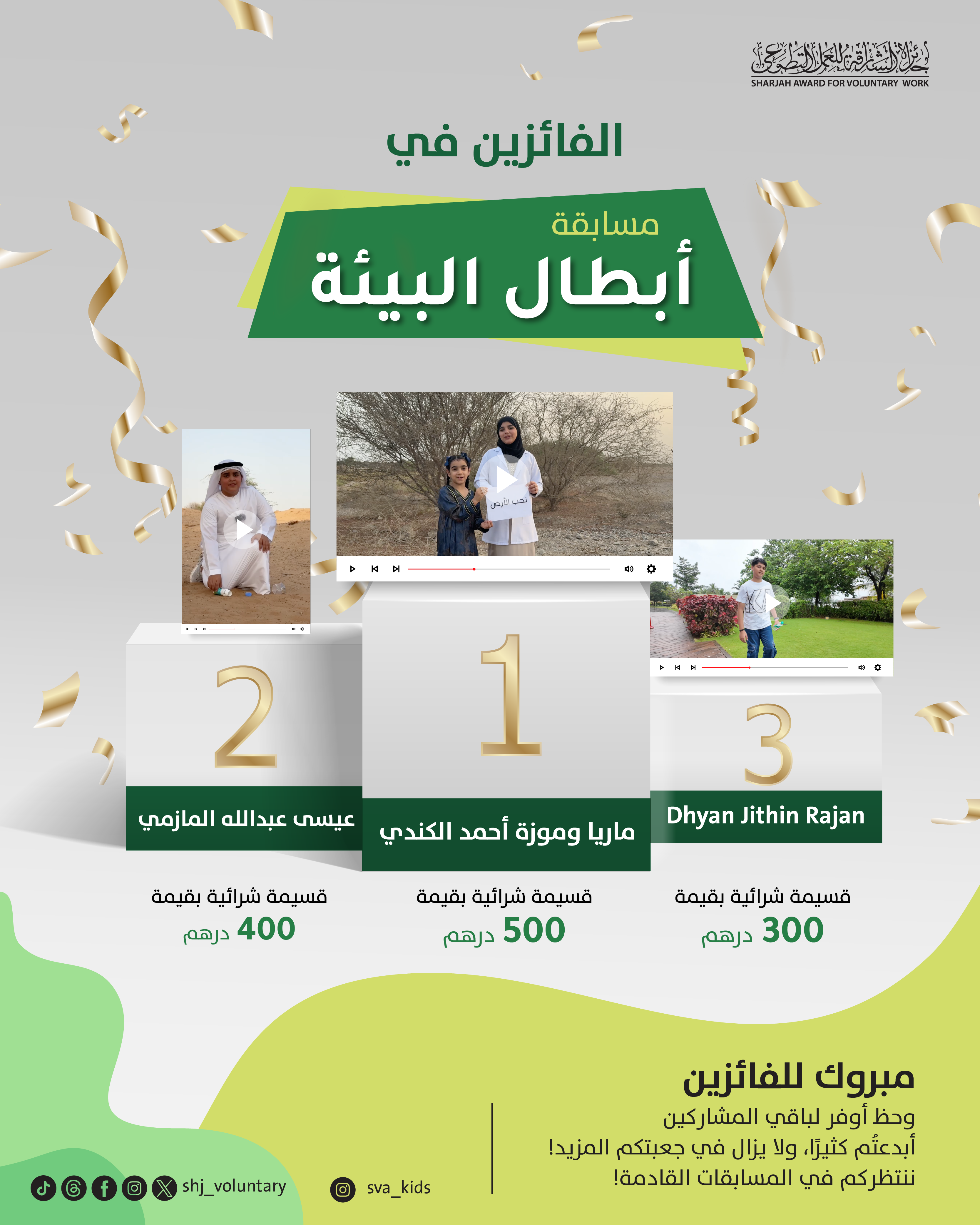 لتحفيزهم على تبني ممارسات تحافظ على البيئة جائزة الشارقة للعمل التطوعي تعلن عن الفائزين بمسابقة أبطال البيئة